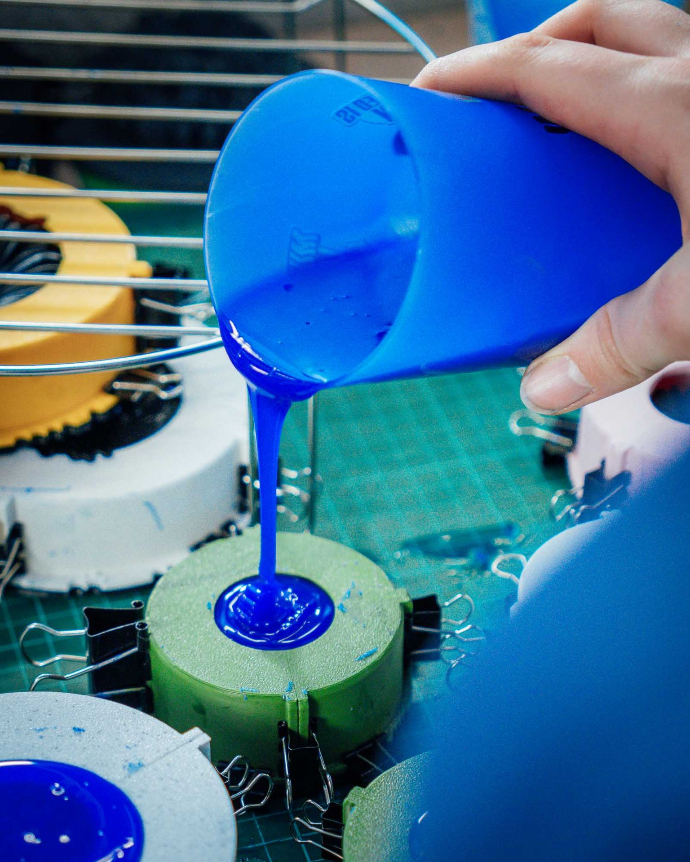 La solution, c'est donc le silicone alimentaire. On a utilisé nos fleurs imprimées en 3D comme "empreintes" pour couler le silicone autour. C'est une étape fascinante qui ressemble beaucoup à... de la pâtisserie ! On dose, on mélange, on chasse les bulles d'air et on coule la matière.