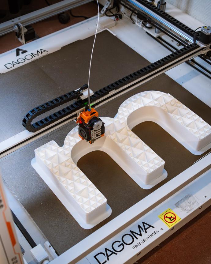 Une fois la modélisation validée, l'enseigne a pris vie dans nos ateliers de production à Roubaix. Grâce à nos capacités d'impression 3D Grand Format, nous avons pu transformer des fichiers numériques en volumes physiques impressionnants en un temps record.