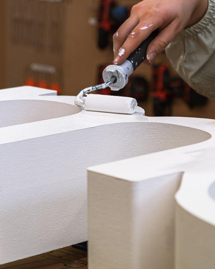 Ce traitement de surface n'est pas qu'esthétique : il permet à la lumière du mapping de "mordre" sur la matière, évitant ainsi les reflets parasites qui casseraient l'immersion. Le résultat final offre une harmonie parfaite entre le relief imprimé et l'animation numérique projetée.