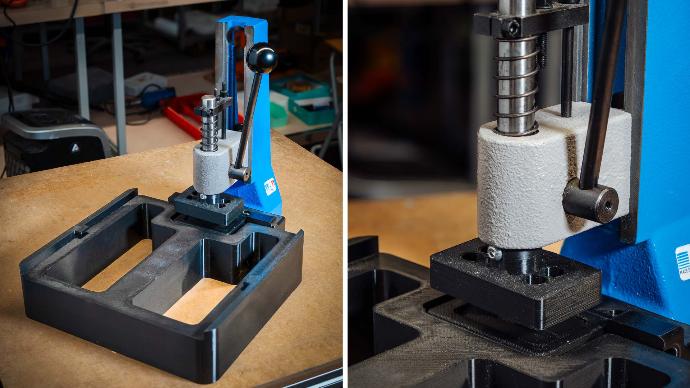 Nous avons alors conçu une presse manuelle personnalisée, pensée spécifiquement pour ce geste de montage.